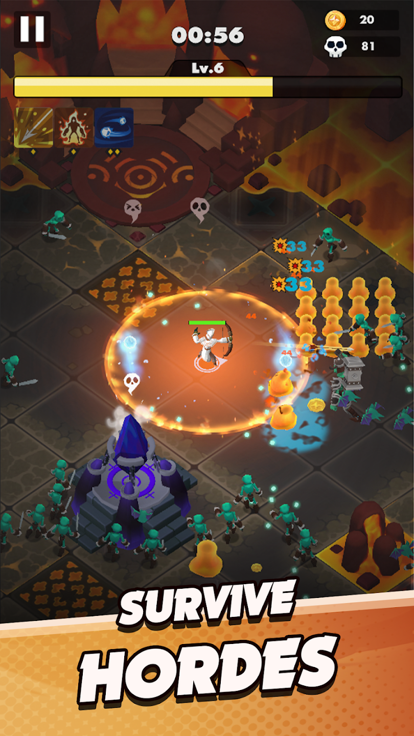 - Survive relentless waves of 1,000+ monsters with just one-thumb controls